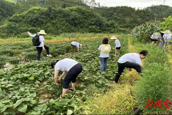 “三下乡”社会实践团队来到征溪口村的罗汉果生产基地和当地村民家中的瓜果地实地调研,当地负责人为师生们讲解了瓜果种植等生态农业项目并指导青年学子进行除草,师生热情高涨,纷纷撸起袖子、光着脚丫展开田间劳作。他们将思政课搬到田间地头,将劳动育人融入课程思政中,让学生在现实的场景、鲜活的实例和亲身的体验中“学思践悟”。