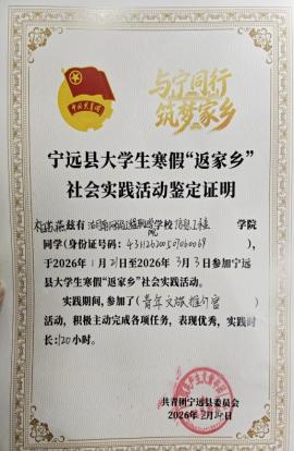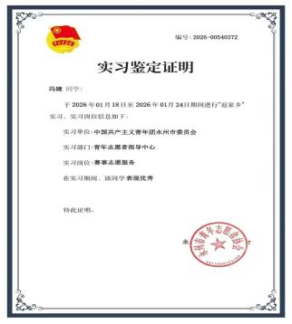 2026年1月21日至2026年3月3日湖南省永州市宁远县参加了“返家乡”社会实践中的“青年文旅推介官”项目。担任文旅推介官总负责人,带领团队前往宁远文庙、古街、九嶷山等景点实地采景拍摄,负责文案撰写、脚本创作、拍摄策划与视频后期剪辑,制作宁远文旅宣传视频,作品在共青团宁远县委官方视频号发布。