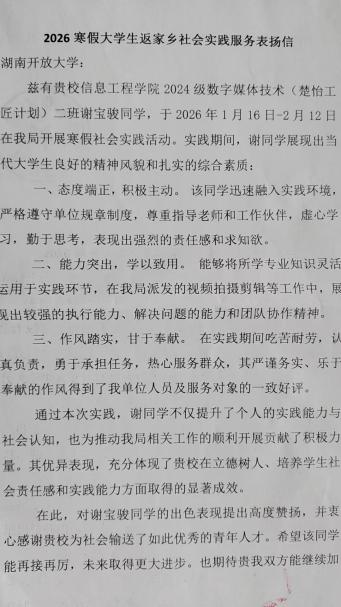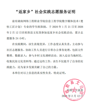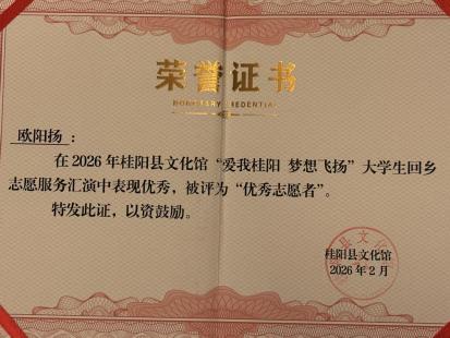 于2026年1月21日至2026年2月13日郴州市桂阳县文化馆参加“大学生回乡志愿文化服务活动”活动期间,态度认真,勤恳付出 ,圆满完成相关志愿服务的同时并受到相关部门嘉奖。