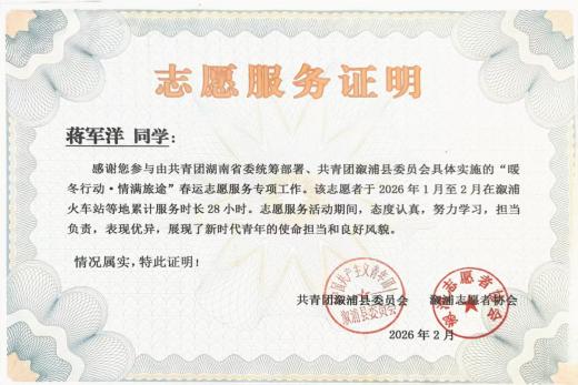 2026年2月9日至2025年2月24日湖南省怀化市溆浦县参加了“2026暖冬行动”志愿活动与家乡路口交通疏通工作。接待进站引导工作,帮助乘客搬运行李,帮助家乡路口疏散通道等。