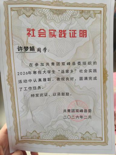 今年寒假,我积极响应大荆镇村委会的号召,参与了“返家乡”志愿服务活动。活动中,我与村委会工作人员一道,对办公区域和公共环境进行了全面清扫和整理,为营造整洁有序的村集体环境贡献了一份力量。这段经历不仅锻炼了我的吃苦耐劳精神,也增强了我的服务意识,更让我切身体会到基层志愿服务的意义,进一步坚定了我回馈家乡、服务乡村的信念。