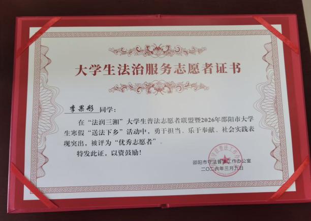 2026年2月6日上午10:00至2026年2月6日下午12:00在新邵县石背垅社区活动中心参加“邵阳市2026年寒假大学生“送法下乡”暨法治文化基层活动-新邵专场。活动期间,主要负责协助现场秩序维护、人员引导、信息登记、物资分发、文明宣传等相关工作,服务态度认真负责,积极主动,圆满完成各项志愿任务。
