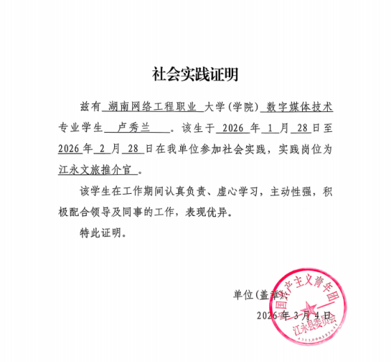 2026年1月28日至2026年2月28日在江永县委员会参加“江永文旅青年推介官”活动期间,主要负责视频拍摄的脚本创作与视频内容呈现等相关工作,结识了许多专业相近的伙伴之余,也在实践过程中对传播家乡文化有了更深理解。